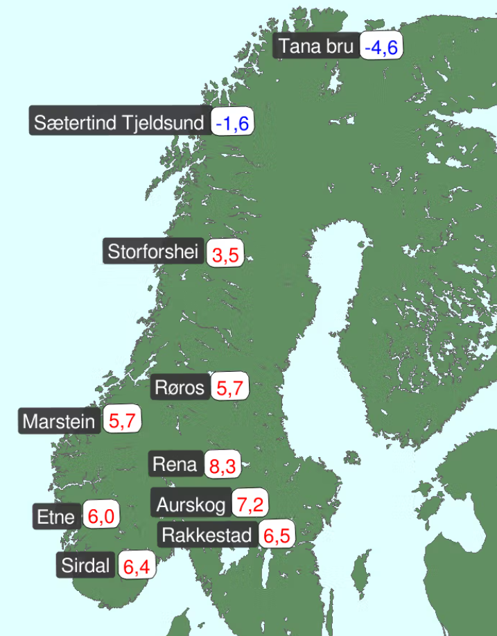 Afwijking van de gemiddelde temperatuur in enkele Noorse regio's. Met 8,3 graden boven normaal (tot 18 december) was het rondom Rena uitzonderlijk zacht. In het uiterste noorden van Noorwegen is december tot nu toe juist te koud verlopen. Bron: yr.no