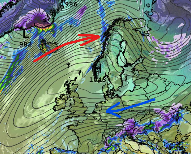 Een hogedrukgebied komt de komende dagen boven het zuiden van Scandinavië te liggen. Het zorgt voor een typische weerkaart met mogelijk schaatsijs in Nederland.