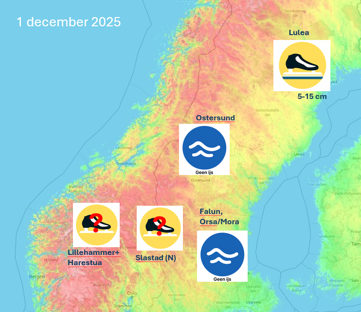 De enige plek waar nu al geschaats kan worden op natuurijs op een uitgezette baan is bij Lulea. De komende dagen gaat de temperatuur hier echter flink omhoog. Het kan er soms zelfs even een beetje dooien.